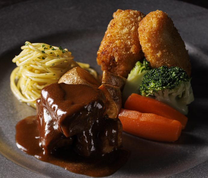 イタリア軒伝統のデミグラスソースに味噌を忍ばせた「牛鍋風ビーフシチュー&蟹クリームコロケット」や、魚沼・塩沢産コシヒカリを使用した割烹 螢の「コシヒカリおにぎり」などのラインナップをご用意しております。